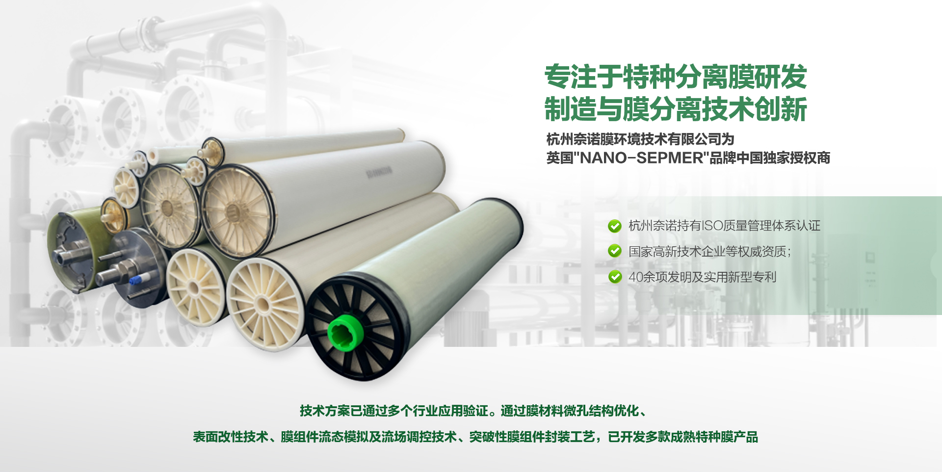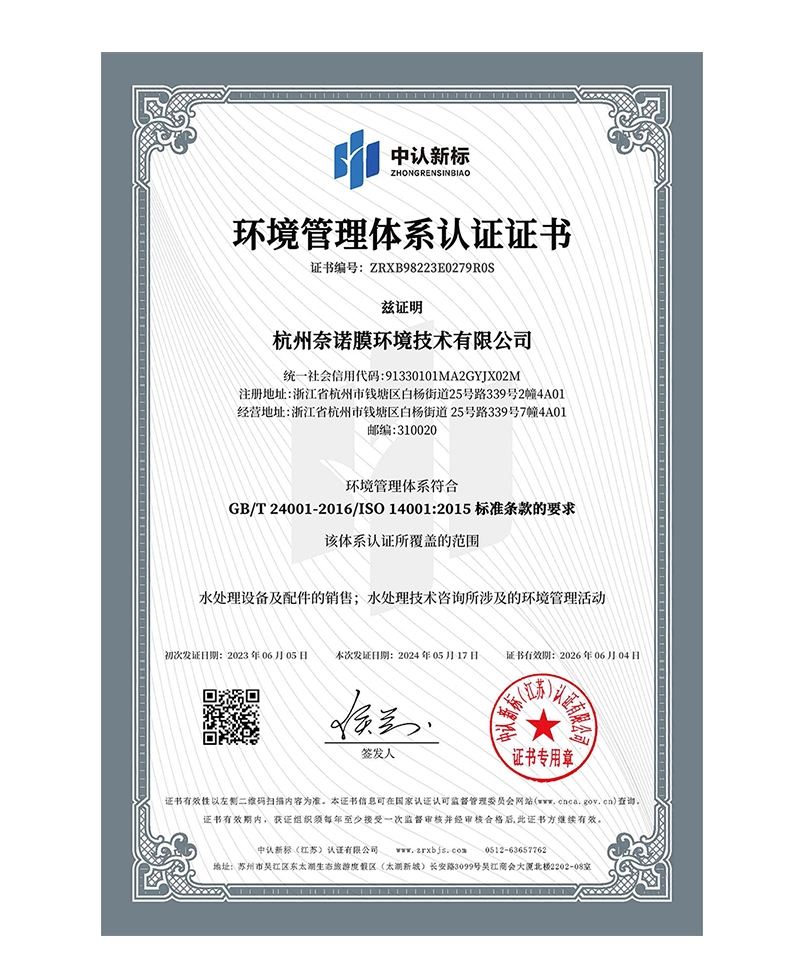 杭州奈诺持有ISO质量管理体系认证、国家高新技术企业等权威资质;40余项发明及实用新型专利,技术方案已通过多个行业应用验证。通过膜材料微孔结构优化、表面改性技术、膜组件流态模拟及流场调控技术、突破性膜组件封装工艺,已开发有--耐高压膜:DTRO/STRO/NF/RO;-耐高温膜:HSUF/NF/RO;耐酸碱膜:ASUF/NF/RO;-耐溶剂膜:SolventRCPUF/NF;超滤膜:TUF/PTFE-MBR;公用净水设备:纳滤净水机/超纯水机;