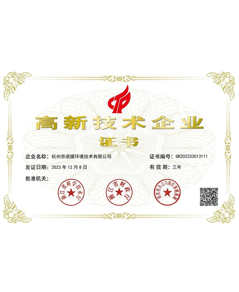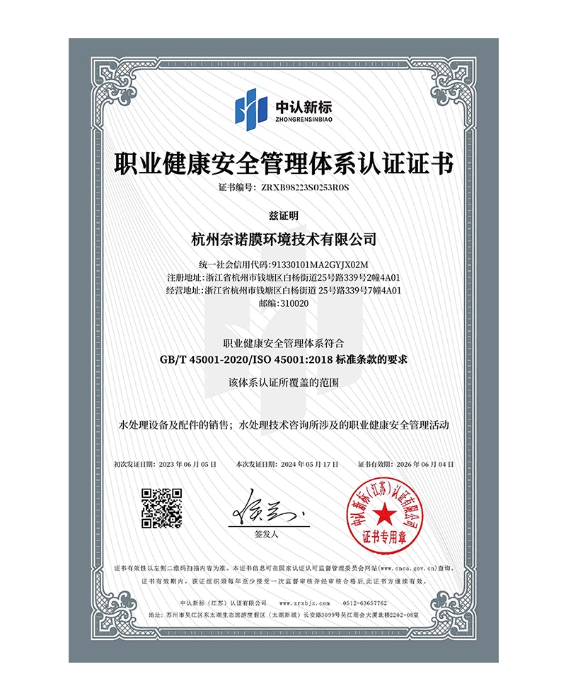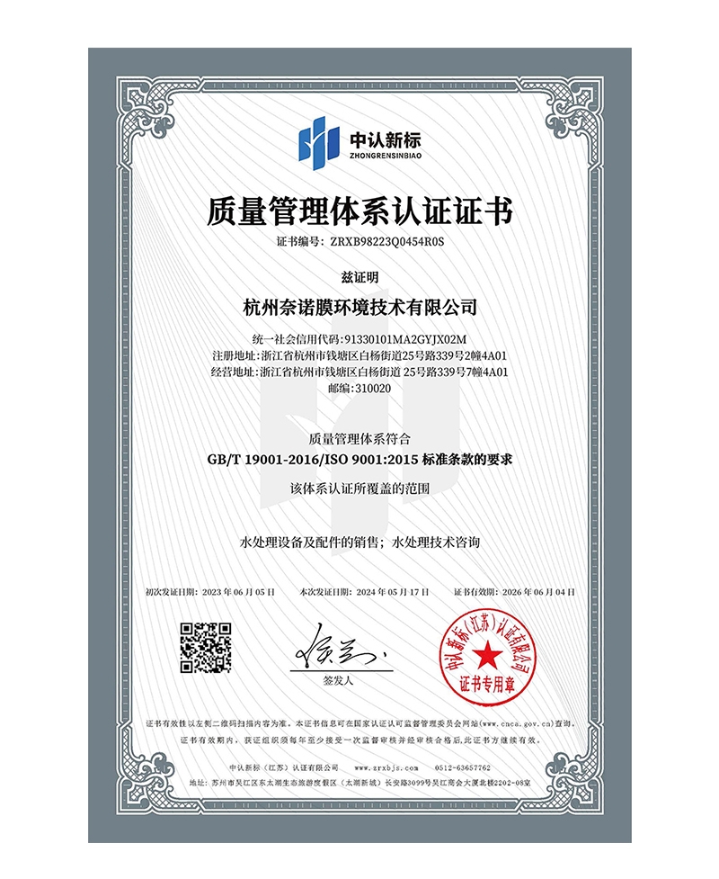杭州奈诺持有ISO质量管理体系认证、国家高新技术企业等权威资质;40余项发明及实用新型专利,技术方案已通过多个行业应用验证。通过膜材料微孔结构优化、表面改性技术、膜组件流态模拟及流场调控技术、突破性膜组件封装工艺,已开发有--耐高压膜:DTRO/STRO/NF/RO;-耐高温膜:HSUF/NF/RO;耐酸碱膜:ASUF/NF/RO;-耐溶剂膜:SolventRCPUF/NF;超滤膜:TUF/PTFE-MBR;公用净水设备:纳滤净水机/超纯水机;